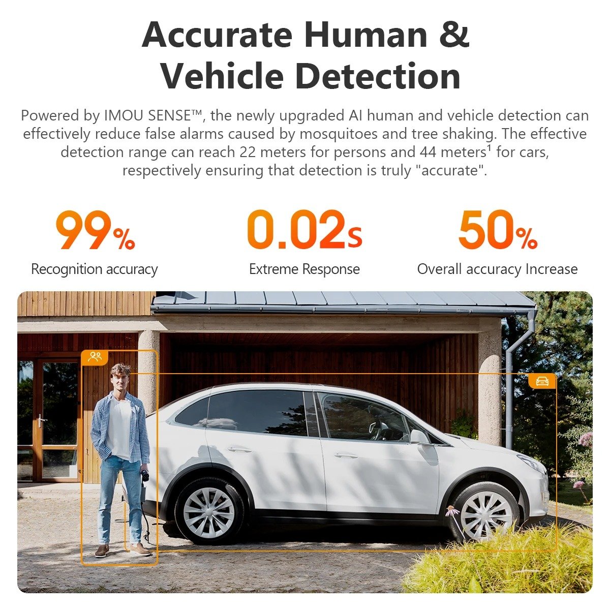 Alimenté par IMOU SENSE™, la détection des humains et des véhicules par IA récemment améliorée peut réduire efficacement les fausses alarmes causées par les moustiques et les secousses des arbres.La portée de détection effective peut atteindre 22 mètres pour les personnes et 44 mètres pour les voitures, garantissant respectivement que la détection est véritablement précise.