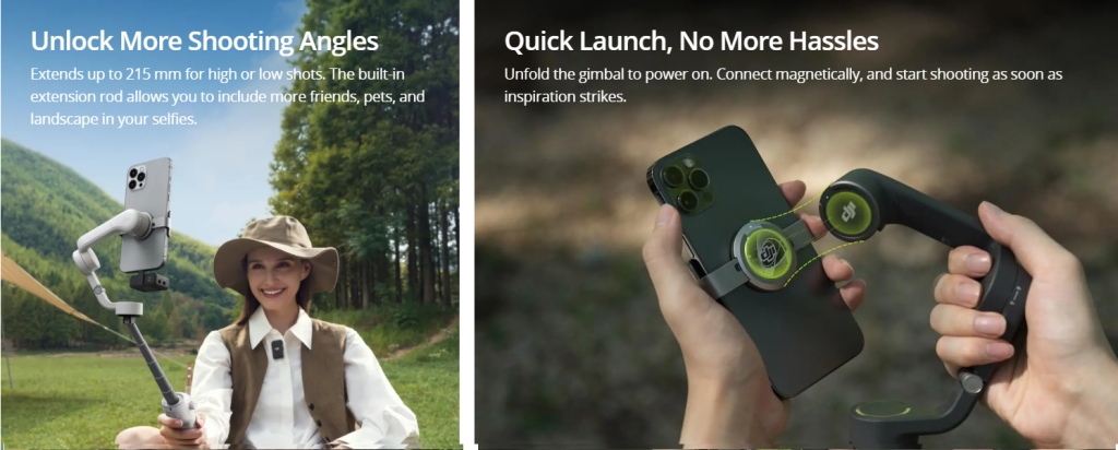 Avec un design pliable et un poids de seulement 309 g, ce stabilisateur pour téléphone portable est facile à transporter partout. Dépliez le bras extensible pour créer des angles créatifs ou réaliser un selfie parfait.