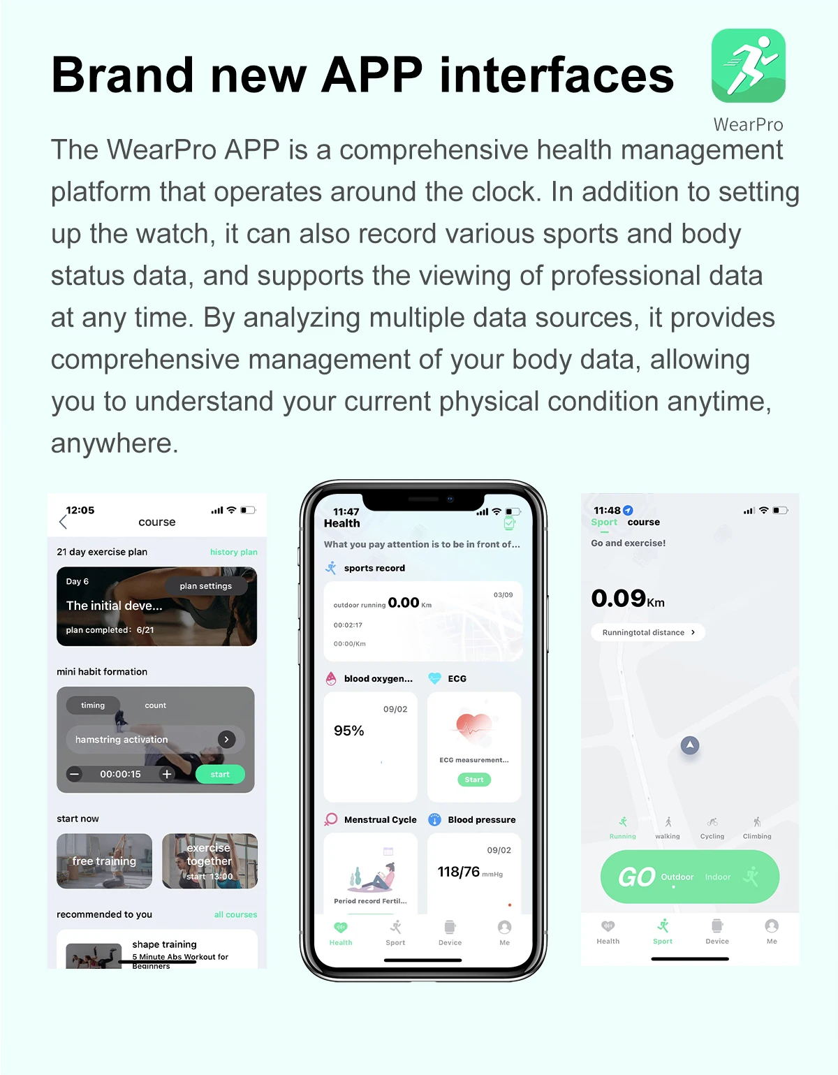 100 + motifs de mouvement, entraînement respiratoire, cadran, chronomètre, contrôle de la luminosité, mode multisports, fréquence cardiaque, informations, musique à distance, météo, trouver le téléphone (disponible après téléphone connecté), appel bluetooth, lecture de musique bluetooth, protection par mot de passe, calculatrice, affichage sur écran partagé, widgets de raccourci, météo, masseur, code QR